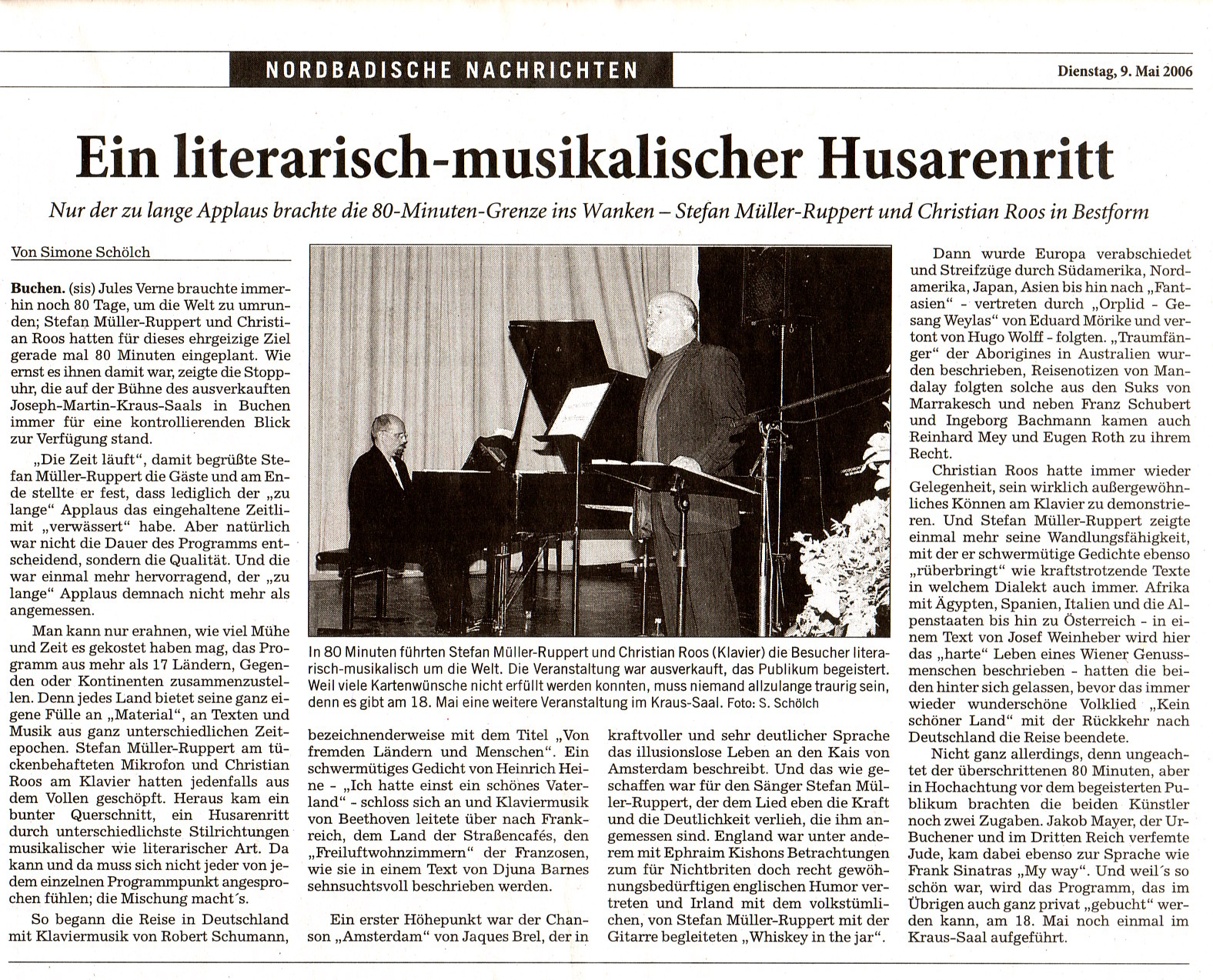 Da Stefan Müller-Ruppert und Christian Roos sowohl in der sogenannten U- wie auch der E-Musik zu Hause sind, gab es bei der Programmauswahl keinerlei Berührungsängste. So finden sich da u.v.a. so unterschiedliche Programmpunkte wie Robert Schumanns „Frühlingsfahrt“, „Amsterdam“ von Jaques Brel, „Whiskey in the jar“ von den Dubliners, „Orplid“ von Hugo Wollf, „Mann aus Allemania“ von Reinhard Mey oder instrumentale Klaviersolo-Stücke von Mendelssohn, Chopin, Strawinsky oder Chick Corea. Der Humor kommt natürlich auch nicht zu kurz und so erklingt neben „literarischem“ von Pablo Neruda, Juan Jimenez oder Berthold Brecht, auch „aus der Feder geflossenenes“ von Kishon, Ustinov oder Eugen Roth.
