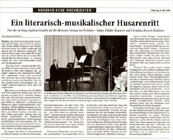 Dies dachten sich der Sänger, Rezitator und Schauspieler Stefan Müller-Ruppert und der Pianist Christian Roos und stellten mit „in 80 Minuten um die Welt“ ein Programm zusammen, welches in seiner abwechslungsreichen Vielfalt so bunt ist, wie der Blick durchs Vergrößerungsglas auf die Erdrotation. Gedichte und kurze Geschichten vereinen sich mit dem klassischen Kunstlied oder Klavierminiaturen ebenso, wie mit Jazznummern, Chansons oder Schlagern zu einem Album musikalisch-literarischer „Ansichtskarten“.